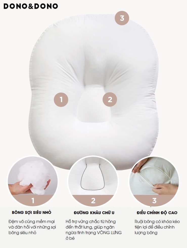 – Vỏ gối 100% cotton cao cấp thoáng mát, mềm mại không gây kích ứng, hầm nóng cho da bé.